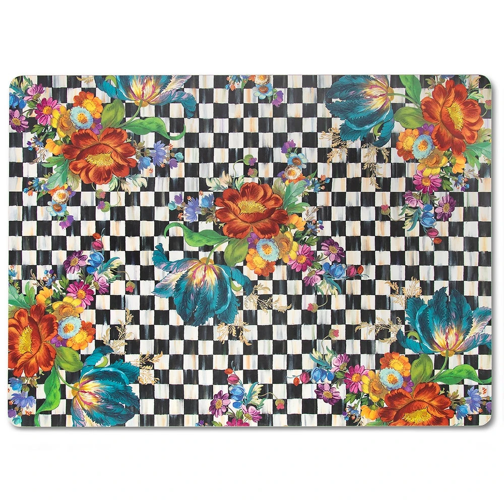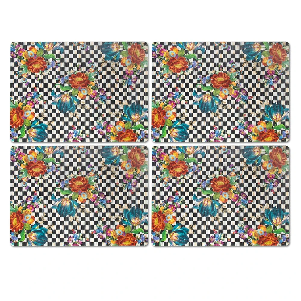 Top your table with our set of four Courtly Flower Market Cork Back Placemats, featuring two of our most popular patterns. The heat-resistant lacquered surface features art prints of our Flower Market and color-dragged black-and-white checked patterns on a hardboard substrate that is backed with natural cork.