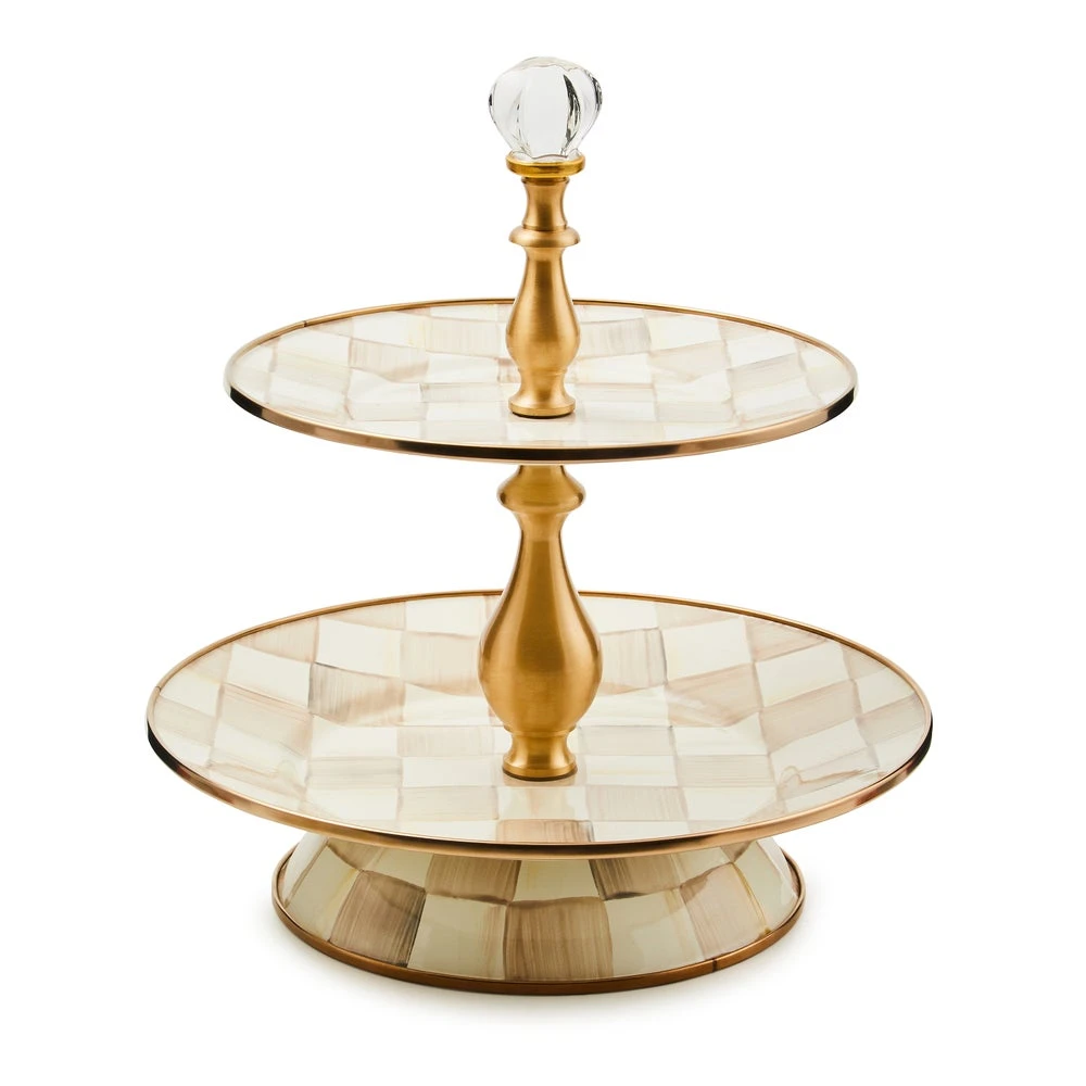 Covered in cupcakes for your princess’s party, or scones and biscotti for your morning coffee club, the Mocha Check Enamel Two Tier Sweet Stand is sure to stand out. It features hand-painted, coffee-coloured checks on enamelled steel, crowned with a glass knob.