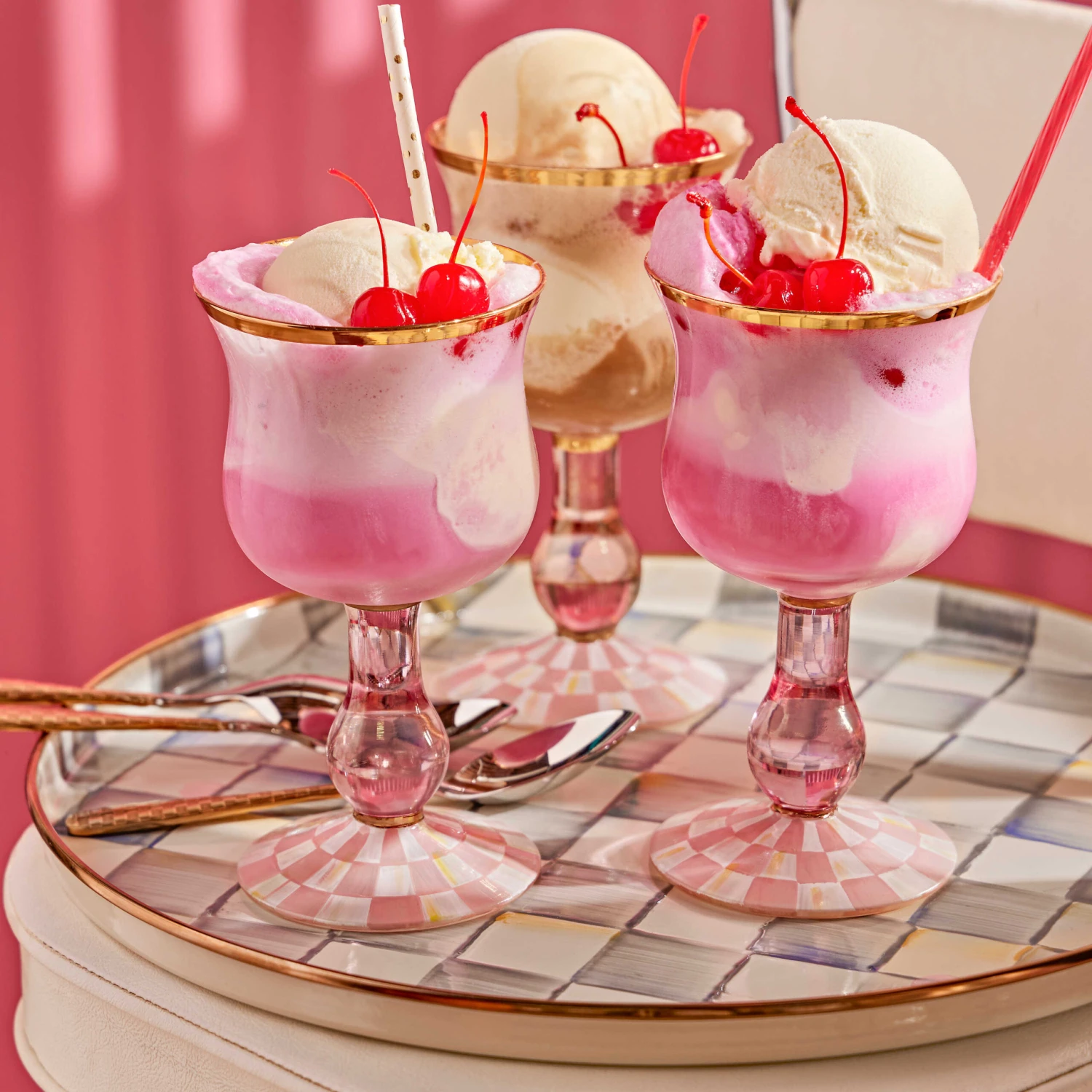 The only thing breezier than a cool cocktail on the screened porch as the summer sun sets, is one served on MacKenzie-ChildsSterling Check Enamel Round Tray. Handy as it is handsome, this entertaining tray is perfect for year-round use, indoors and out. A subtle jewel-tone palette is woven by an artisan’s brush through the glossy, hand-painted grey checks.