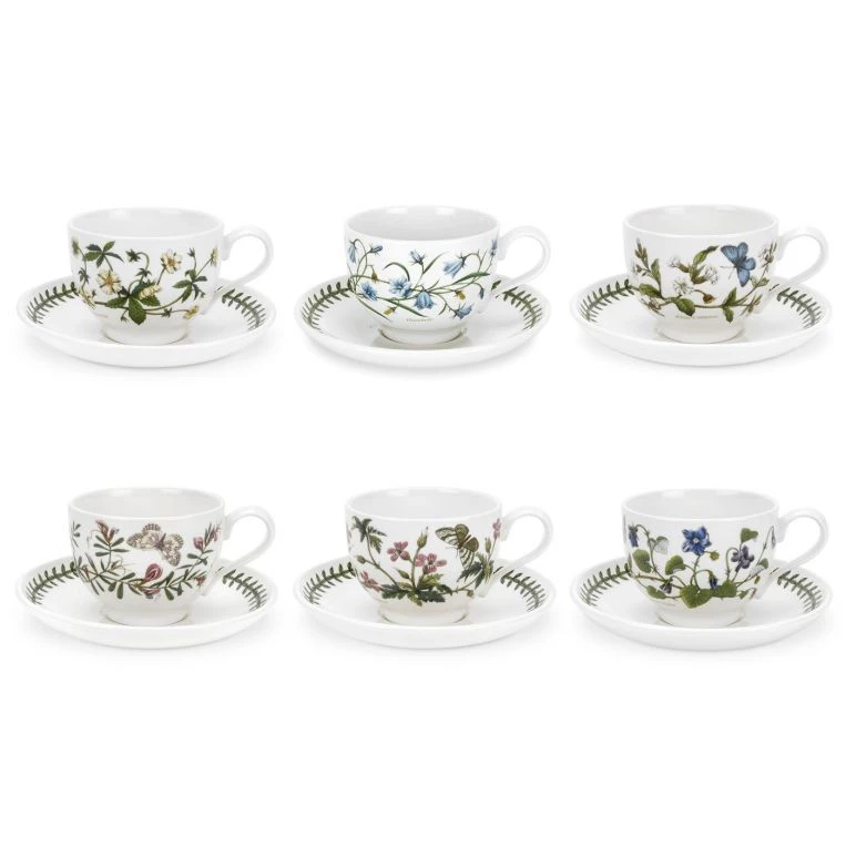 Set of 6 Portmeirion Botanic Garden Breakfast Cup and Saucer (Traditional Shape) with New Motifs
